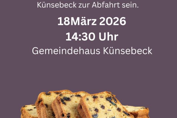 Am kommenden Mittwoch, 18.03., trifft sich die Frauenhilfe Künsebeck um 14.00 Uhr auf dem Parkplatz am neuen Gemeindehaus. An diesem Nachmittag geht es zum Pickertessen nach Werther und es sind alle herzlich eingeladen.