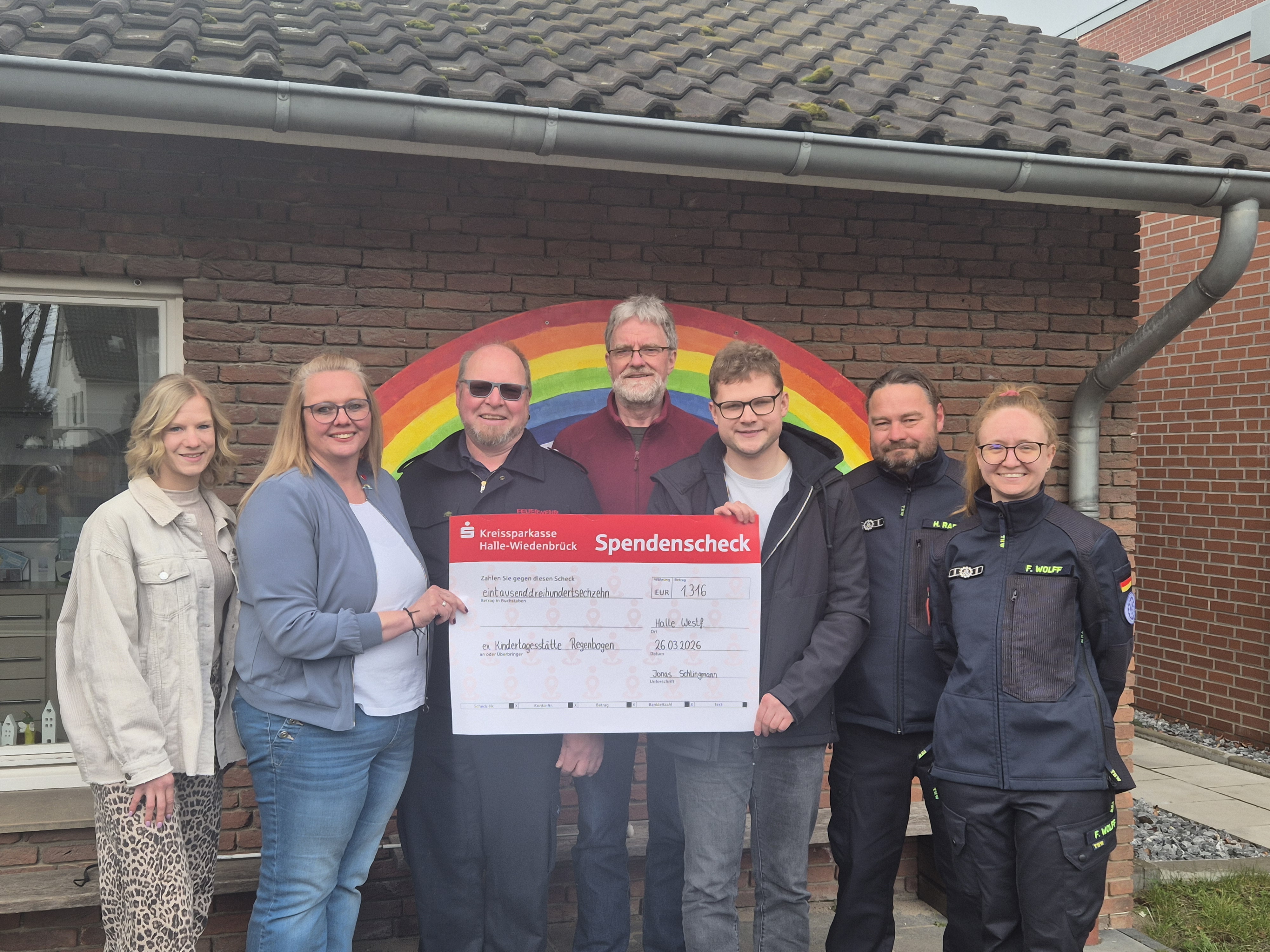 Feuerwehr) den Scheck an Regenbogen-Kita-Leiterin Nadine Schech und ihre