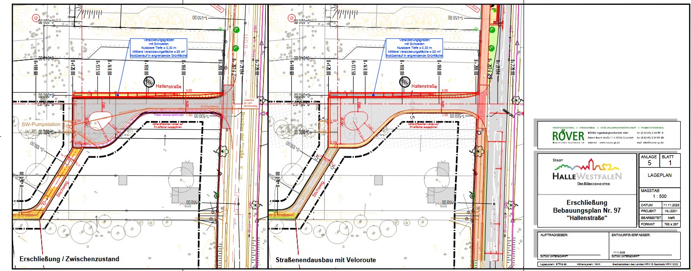 Der Bebauungsplan 97 „Hallenstraße“ befindet sich derzeit in der Aufstellung. Begleitend hierzu ist die Erschließungs- und Straßenplanung erstellt worden. Mit den Planungsaufgaben ist das Ingenieurbüro Röver, Gütersloh beauftragt worden.