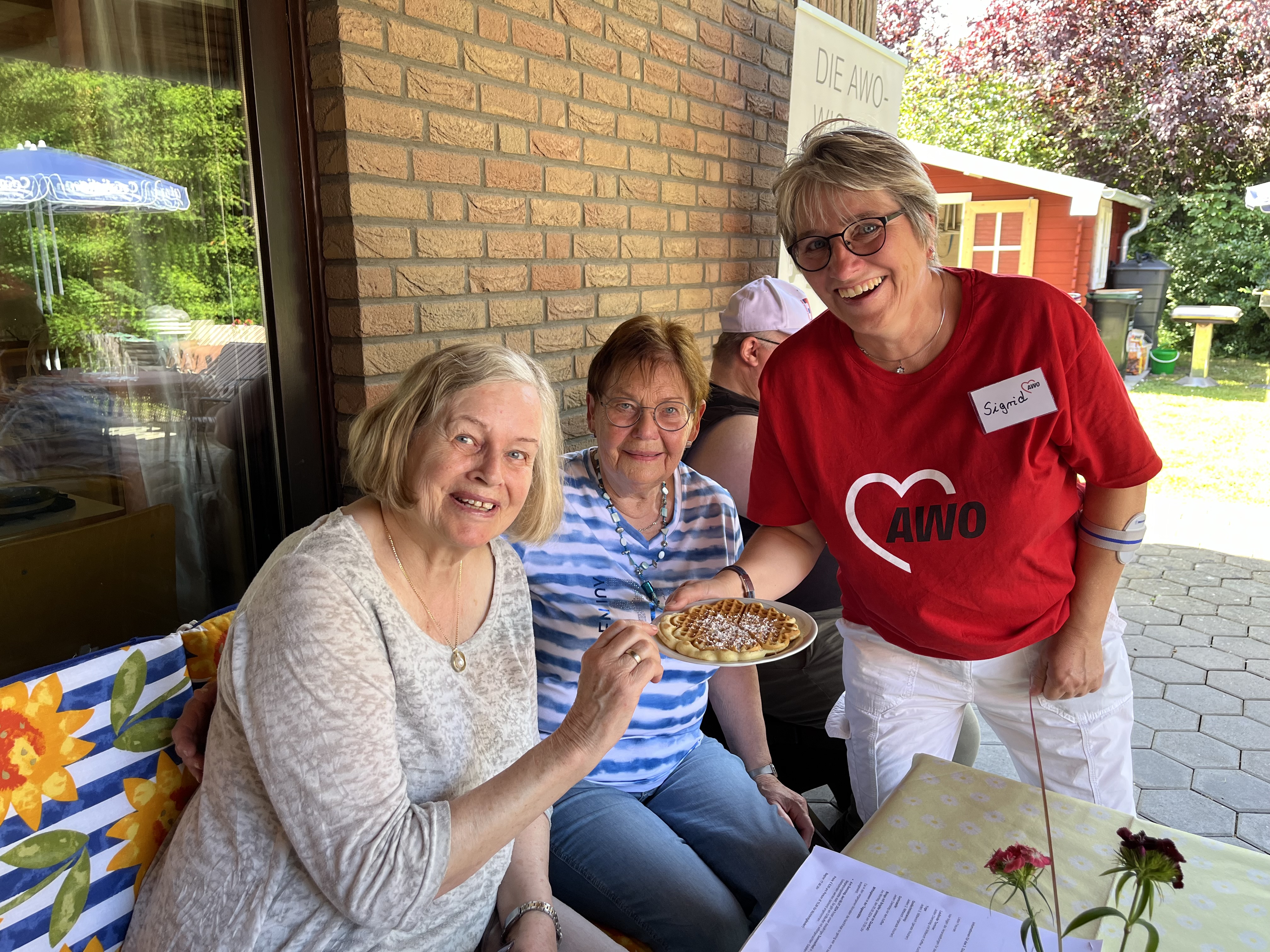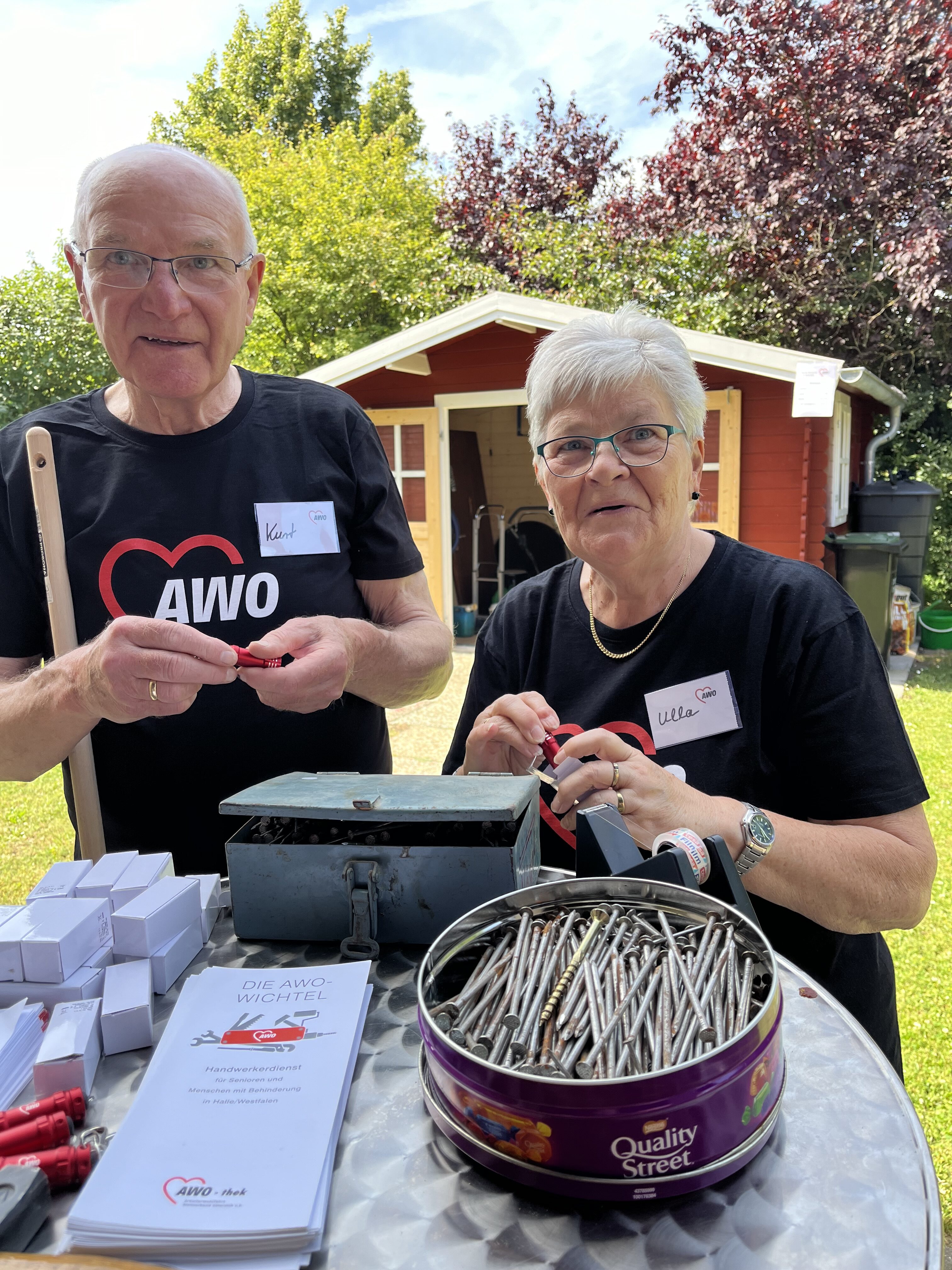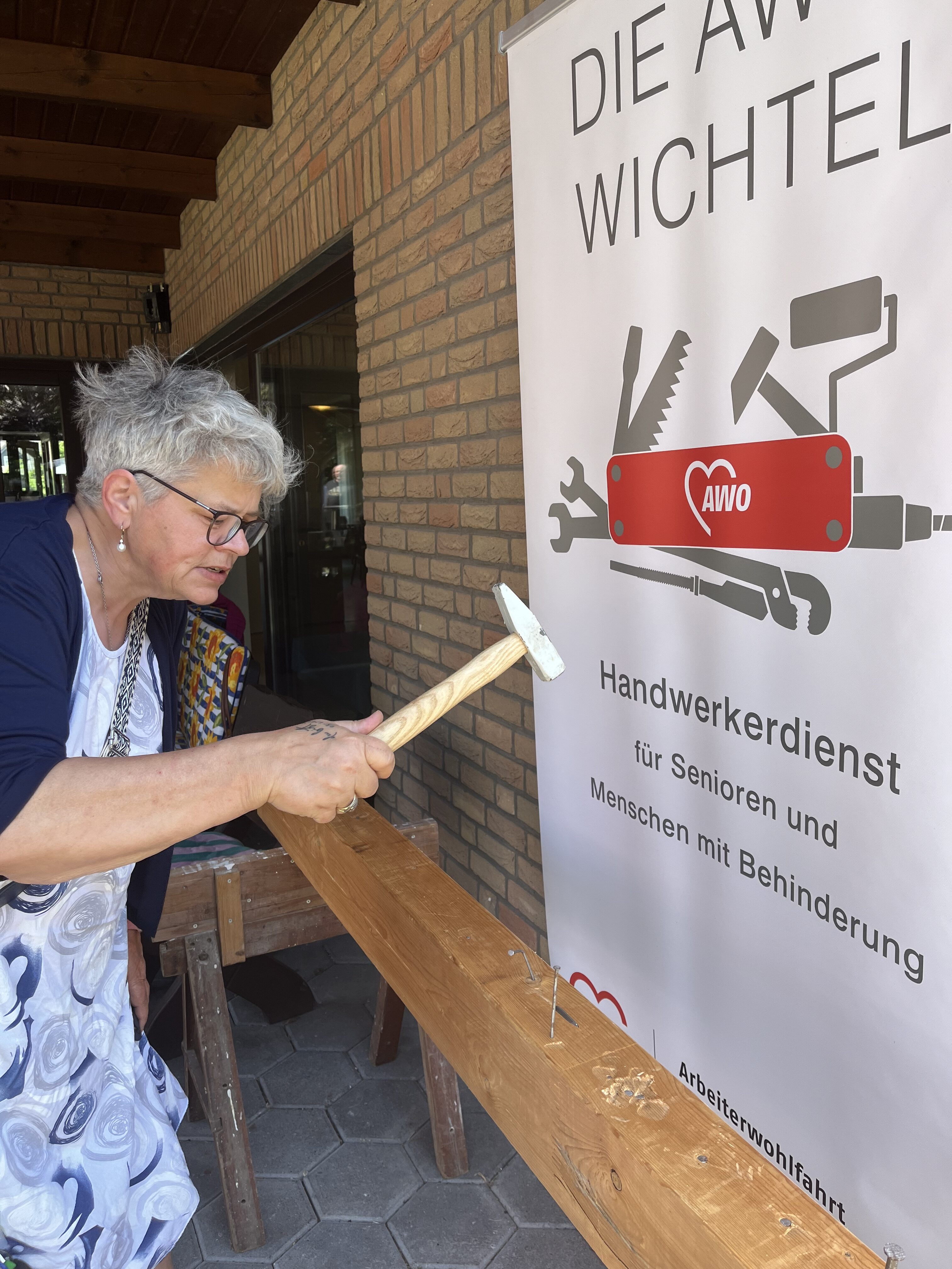 Die Sonne strahlte und die Mitglieder des AWO Ortsvereines Künsebeck ebenso. Zum ersten Tag der offenen Tür lud der Ortsverein der Arbeiterwohlfahrt in Künsebeck ein. Ab 11:00 Uhr konnte in das Programm der Tagesstätte in der Talstraße geschnuppert werden. Von Gedächtnistraining über Yoga bis hin zu den unterschiedlichen Spielangeboten war alles dabei. Neben dem alltäglichen Programm was wöchentlich stattfindet, gab es natürlich auch selbst gemachte Torten, frisch gebackene Waffeln und kulinarisches vom Grill. Das 15 köpfige Team rund um Sigrid Schlüppmann als Vorsitzende Ortsvereins sorgte nicht nur für beste Unterhaltung, sondern versorgte die Gäste auch mit vielen Informationen. Beispielsweise konnte sich bei Kurt Picker und Manfred Nowak, den Wichteln der Arbeiterwohlfahrt, am Nagelbalken gemessen werden. Wer braucht weniger Schläge um den riesen Nagel im Balken zu versenken? Dazu gab es dann Informationen rund um den Service der Wichtel. Diese kommen ins Haus wenn zum Beispiel jemand nicht mehr selbstständig die Glühbirne auswechseln kann, der Wasserhahn tropft oder der Rollladengurt gerissen ist. Auch zur Wohnberatung des Kreisverbandes der Arbeiterwohlfahrt gab es einige Informationen. Hier steht die Frage im Vordergrrund, wie schaffe ich es mit Hilfe von Umbau so lange wie möglich zu Hause zu wohnen.