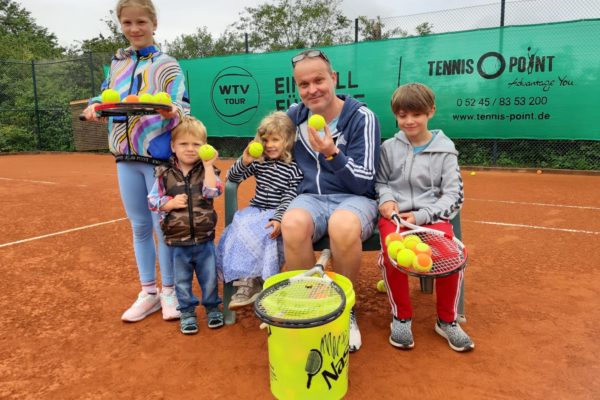 Tennislehrer und Zauberer Meiko Gaese lud zum Tenniscamp. Neben den ersten Schwüngen und Ballgefühl Vermittlung wurde natürlich auch gezaubert. So lernten die Kids die 20 € Büroklammer Hochzeit kennen – natürlich mit Spielgeld 🙂