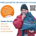 Willkommen sind natürlich auch Süßigkeiten, Hustenbonbons, Rosinen, aber auch Brillenputztücher, warme Handschuhe, Strümpfe oder Mützen. Weitere Tipps gibt es auf dem aktuellen Flyer zur Aktion – erhältlich überall dort, wo es auch die blauen Taschen gibt: In der Hauptstelle der Volksbank Halle, im Rathaus I (Info) oder im Bürgerbüro, bei Maria Carotta (Lotto, Zeitschriften, Tabakwaren) am Künsebecker Weg, bei Wine & Spirits von Dieter Büsselberg in der Alten Lederfabrik und im Tante Enso an der Hauptstraße in Künsebeck (während der personalbesetzten Zeiten). In den meisten ist schon eine Weihnachts-Grußkarte auf Lettisch mit Haller Motiv enthalten. Man kann aber auch eigene Baumwolltaschen packen, der Flyer ist auch auf der Hompage der Stadt Halle zu finden unter www.hallewestfalen.de/freundeskreis-valmiera