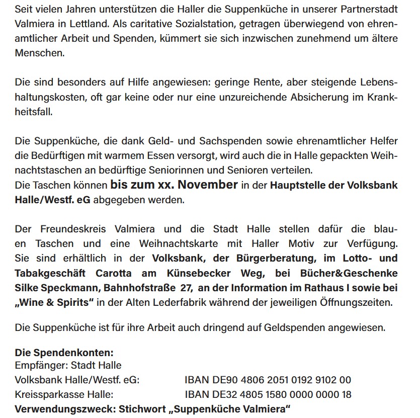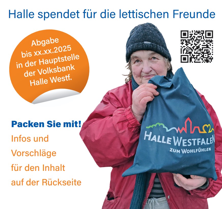 Willkommen sind natürlich auch Süßigkeiten, Hustenbonbons, Rosinen, aber auch Brillenputztücher, warme Handschuhe, Strümpfe oder Mützen.  Weitere Tipps gibt es auf dem aktuellen Flyer zur Aktion – erhältlich überall dort, wo es auch die blauen Taschen gibt: In der Hauptstelle der Volksbank Halle, im Rathaus I (Info) oder im Bürgerbüro, bei Maria Carotta (Lotto, Zeitschriften, Tabakwaren) am Künsebecker Weg, bei Wine & Spirits von Dieter Büsselberg in der Alten Lederfabrik und im Tante Enso an der Hauptstraße in Künsebeck (während der personalbesetzten Zeiten). In den meisten ist schon eine Weihnachts-Grußkarte auf Lettisch mit Haller Motiv enthalten. Man kann aber auch eigene Baumwolltaschen packen, der Flyer ist auch auf der Hompage der Stadt Halle zu finden unter  www.hallewestfalen.de/freundeskreis-valmiera