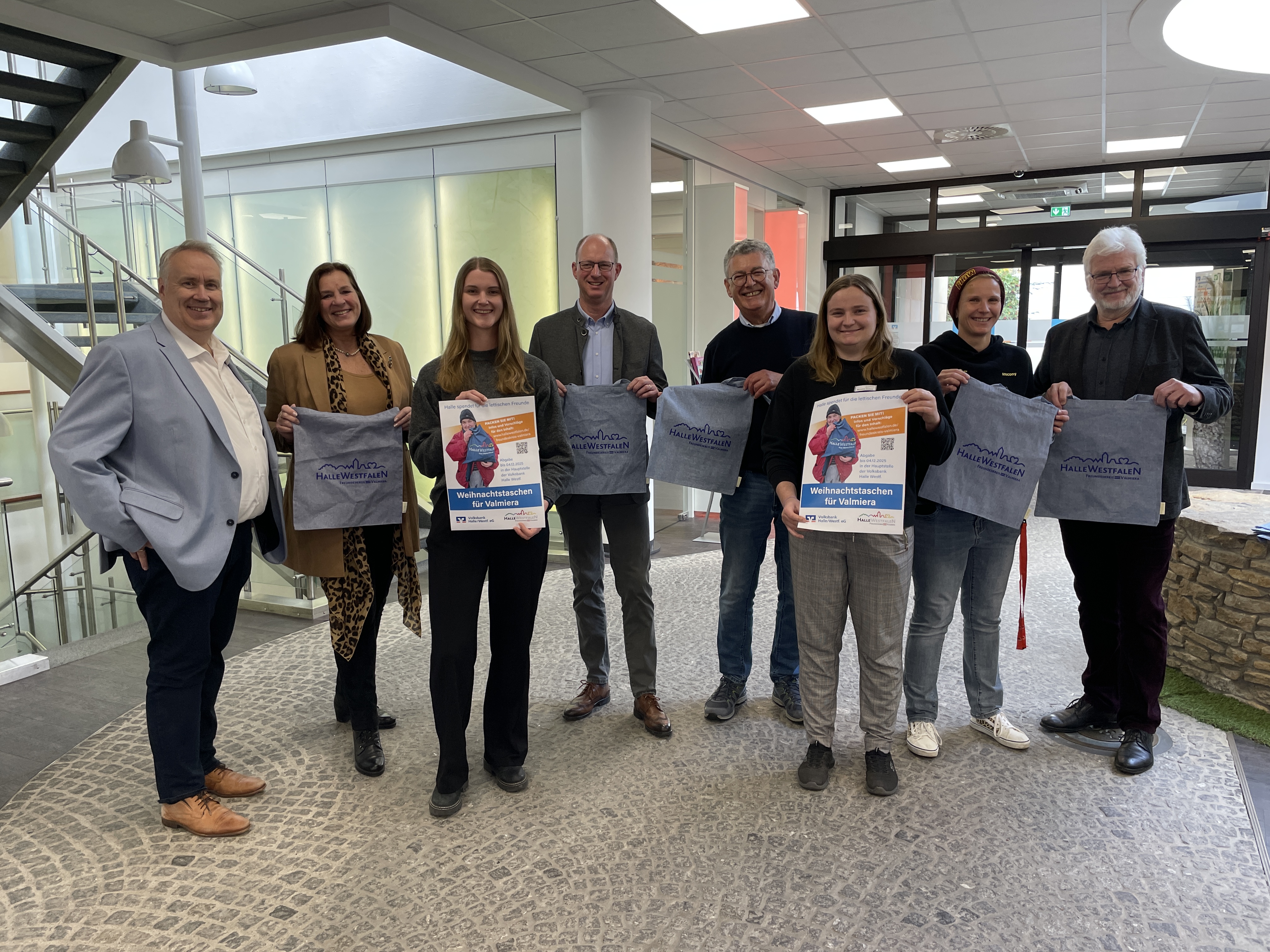 Willkommen sind natürlich auch Süßigkeiten, Hustenbonbons, Rosinen, aber auch Brillenputztücher, warme Handschuhe, Strümpfe oder Mützen. Weitere Tipps gibt es auf dem aktuellen Flyer zur Aktion – erhältlich überall dort, wo es auch die blauen Taschen gibt: In der Hauptstelle der Volksbank Halle, im Rathaus I (Info) oder im Bürgerbüro, bei Maria Carotta (Lotto, Zeitschriften, Tabakwaren) am Künsebecker Weg, bei Wine & Spirits von Dieter Büsselberg in der Alten Lederfabrik und im Tante Enso an der Hauptstraße in Künsebeck (während der personalbesetzten Zeiten). In den meisten ist schon eine Weihnachts-Grußkarte auf Lettisch mit Haller Motiv enthalten. Man kann aber auch eigene Baumwolltaschen packen, der Flyer ist auch auf der Hompage der Stadt Halle zu finden unter www.hallewestfalen.de/freundeskreis-valmiera