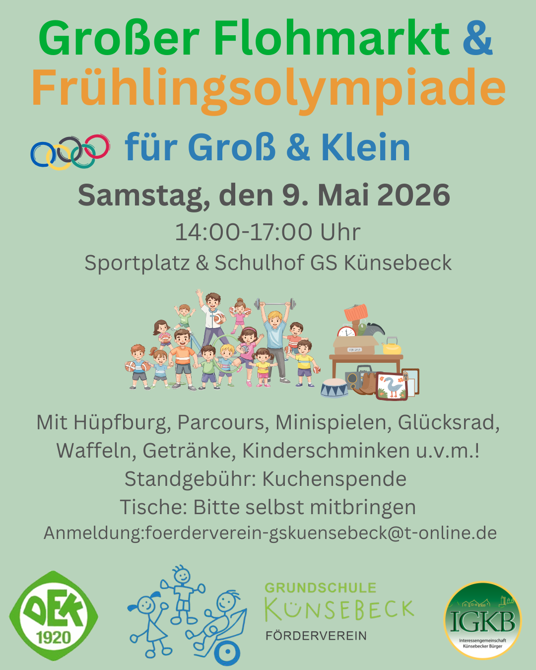 Am Samstag, den 9. Mai, ist rund um die Grundschule Künsebeck einiges los! Von 14 bis 17 Uhr erwartet Besucherinnen und Besucher ein bunter Nachmittag mit Spiel, Sport, Mitmachaktionen und Flohmarktständen für die ganze Familie.