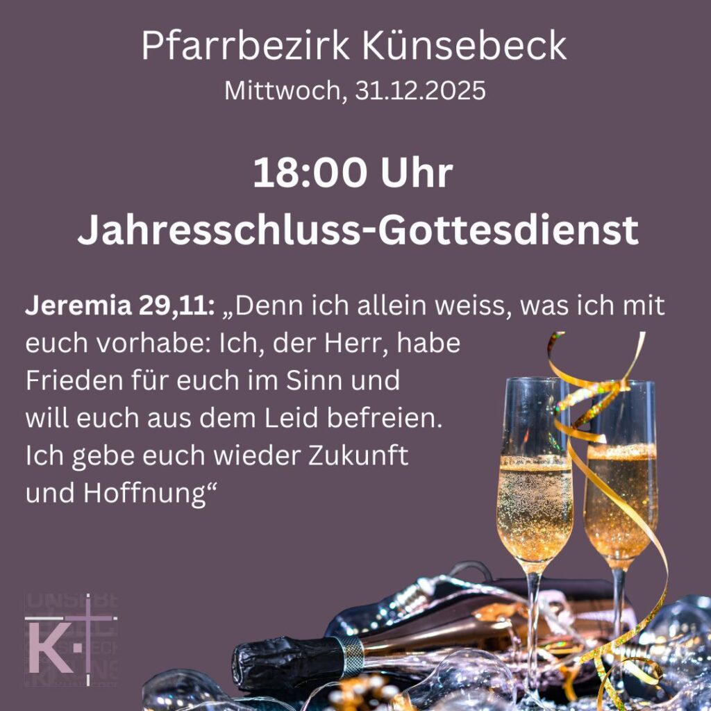 Am Jahresende lädt der Pfarrbezirk traditionell zum Jahresschlussgottesdienst mit Abendmahl. Es werden alle getauften, getrauten, konfirmierten und verstorbenen aus Künsebeck verlesen und ihnen gedacht. Die Gottesdienst hält Pfarrer i.R. Jürgen Michel.