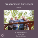 Die Frauenhilfe Künsebeck kommt zu ihrem nächsten Treffen am morgigen Mittwoch, 24. September, zusammen. Die Frauen treffen sich um 14.30 Uhr am Gemeindehaus in Künsebeck, um von dort aus gemeinsam zu starten. Das Treffen selbst findet dann bei Frau Schulze statt.