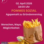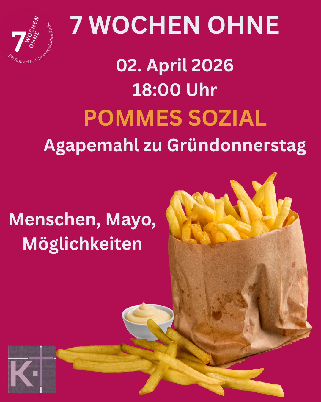 Genau dieses verbindende Element soll am Gründonnerstag erfahrbar werden. Auch das klassische Abendmahl wird nicht fehlen, in diesem Jahr allerdings auf westfälische Art, wie es sich mitten in Ostwestfalen gehört. Pommes sozial. Menschen, Mayo, MöglichkeitenAlle Interessierten sind herzlich eingeladen. Wer möchte, kann gern etwas für das Mitbring-Buffet beisteuern oder einfach kommen und genießen.