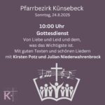 Am kommenden Sonntag um 10 Uhr lädt der Evangelische Pfarrbezirk Künsebeck zum Gottesdienst ein. Zu Gast aus Steinhagen sind Pfarrerin i. R. Kirsten Potz und Popkantor Julian Niederwahrenbrock. Gemeinsam gestalten sie eine Stunde, die sich den großen Themen des Lebens widmet: Von Liebe und Leid und dem, was wirklich zählt – mit guten Texten und schönen Liedern. Für den musikalischen Rahmen sorgt Julian Niederwahrenbrock, Popkantor im Kirchenkreis Tecklenburg. Er gilt als einer der prägenden Köpfe der Pop- und Gospelmusik in der Evangelischen Kirche von Westfalen, leitet die Popkantorei „UNiSONO“ und begeistert mit modernen Klängen zwischen Pop, Gospel und Liedern zum Mitsingen. Kirsten Potz war viele Jahre Pfarrerin in Steinhagen und als Regionalpfarrerin im Amt für Mission, Ökumene und kirchliche Weltverantwortung tätig. Seit ihrem Ruhestand im Jahr 2023 engagiert sie sich weiterhin im Gustav-Adolf-Werk Westfalen und bringt ihre weltweiten Erfahrungen in den Gottesdienst ein. In Künsebeck predigt sie über Trost, Hoffnung und Nächstenliebe im Alltag. Der Gottesdienst in der Evangelischen Kirche Künsebeck beginnt um 10 Uhr. Im Anschluss gibt es Gelegenheit zum Austausch mit den Mitwirkenden.