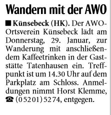 Der AWO-Ortsverein Künsebeck lädt zur Wanderung am morgigen Mittwoch, 6. November, in Künsebeck ein. Treffen ist um 14 Uhr in der Talstraße. Nach der Wanderung gibt es selbstgebackenen Pickert.